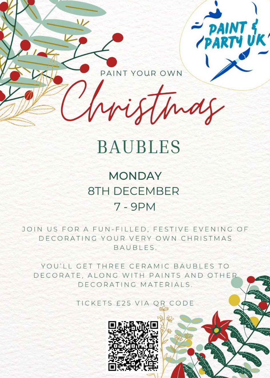 Get creative this Christmas and join us for a fun-filled evening of bauble painting! Enjoy a relaxed, festive atmosphere as you design and decorate your own set of three baubles, and a drink waiting for you on arrival. It’s the perfect seasonal activity to share with friends, unwind, and make something truly special for the holidays. ?✨?